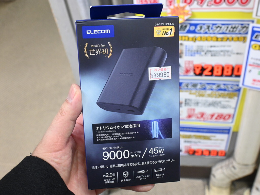ナトリウムイオン電池を世界で初採用したモバイルバッテリー「DE-C55L-9000BK」がエレコムから発売。テクノハウス東映にて9980円で販売されている。