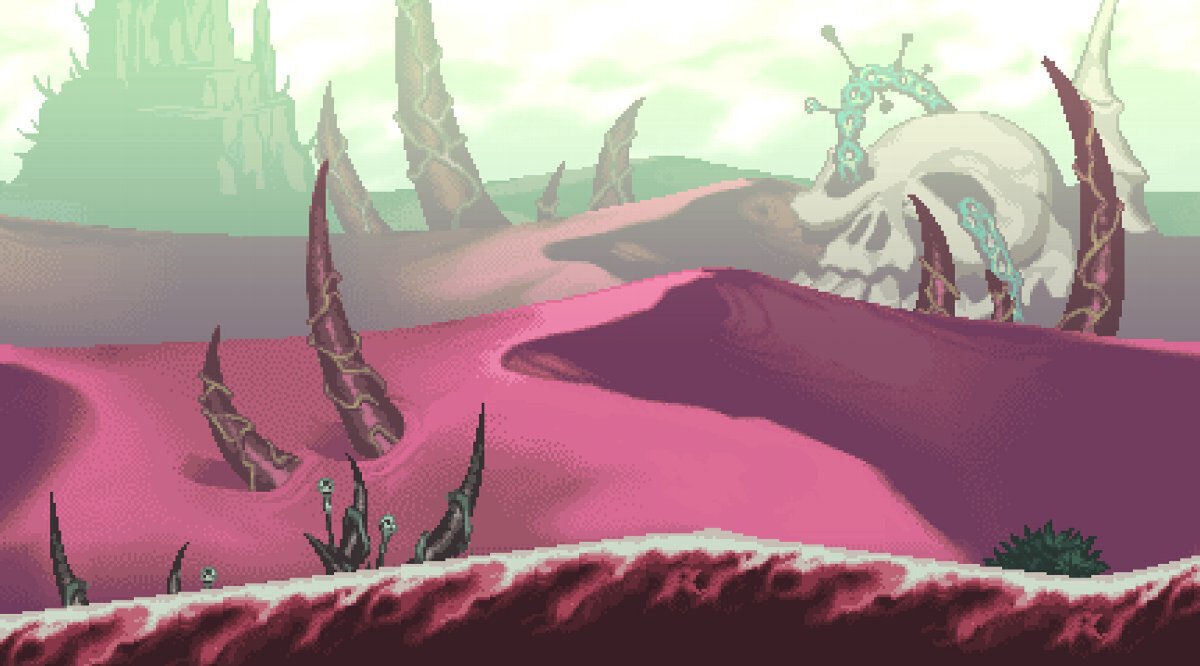 深紅の砂で満たされた大砂漠。遠い昔、ある巨人の魔王がここで命を絶ち、その血を吸った大地が今なお残っているという。