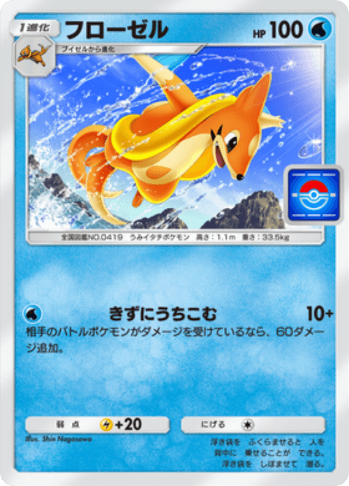 フローゼルはワザ、HPともにノーマル版と違い、ノーマル版がHP90に対してプロモ版はHP100。ワザは、ノーマル版が1エネ30ダメージの「ウォーターアロー」なのに対して、プロモ版のワザ「きずにうちこむ」は、基礎ダメージ10に加え、相手ポケモンがダメージを受けていれば+60ダメージで合計70ダメージを与えられる、ハギギシリの1進化バージョンのような効果。ハギギシリと比べ、1エネで動けるのが偉すぎるので、ぜひこの機会に2枚ゲットしておきたい。