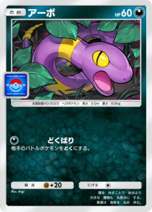プロモ版アーボもノーマル版とは性能違い。HPはノーマル版より10低い60。ワザの「どくばり」は、ワザのダメージこそないが、相手のバトルポケモンをどくにする。1エネで毒・ダメージ共に持っている悪タイプポケモンはほかにもいるけど、進化先に「おいつめる」が使える「最強の遺伝子」版のアーボックを選べるのが強い。毒状態のまま、ベンチに逃げられなくなるのがかなり嫌らしいので、こちらもぜひ2枚はゲットしておこう。