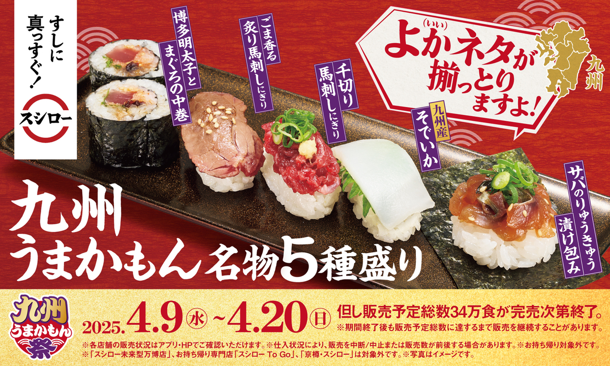 スシローは「九州うまかもん祭」を4月9日より全国で開催する。