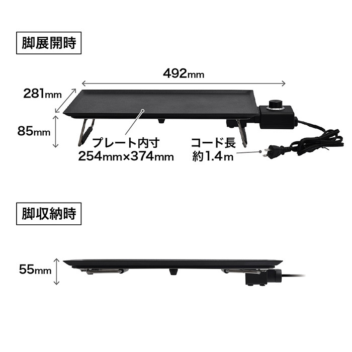 また、温度調整は非常にシンプルで、ダイヤルを回すだけで2段階に切り替えることが可能です。弱モードはパンケーキや保温に、強モードはステーキや焼肉に最適です。