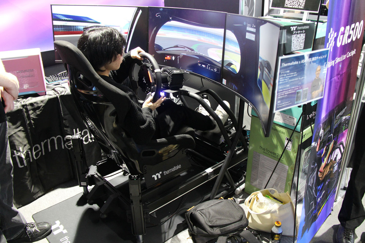 レーシングシミュレーター「GR500」の体験コーナー。レーシングシムを熟知したカイル氏がモーション・コントロールの設定をしているので本格レース仕様の挙動を楽しめる