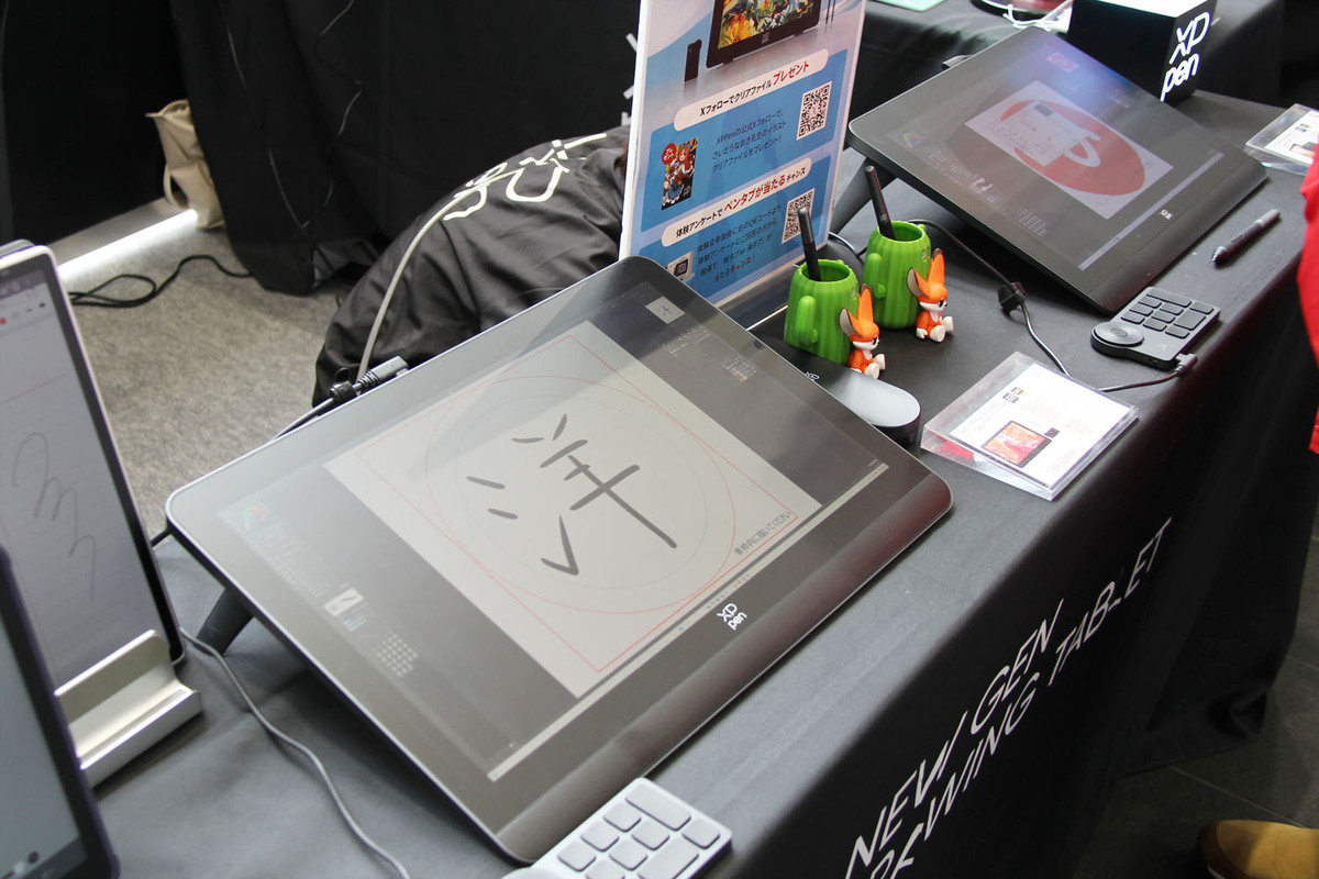 液晶タブレットで描いたデザインを缶バッジにしてくれるデモを実施