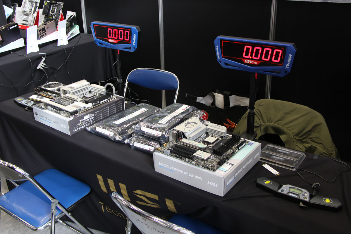 SSD、メモリー、ビデオカードをマザーボードに取り付ける体験コーナー。取り付けにかかった時間を計測するタイムアタック方式になっている