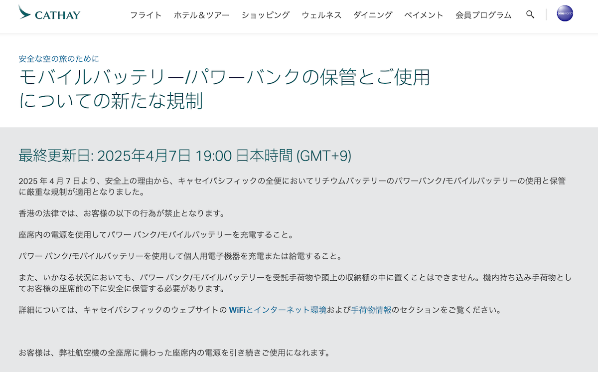 直近では、2025年4月7日から香港の航空会社でも同様の規制がスタートしています。実は同年3月、香港航空の機内で、同じように頭上の荷物棚から発火して緊急着陸という事故が起きており、これを受けた変更と見られます。規制の内容は、モバイルバッテリーを頭上の荷物棚に収納できないほか、機内での使用も禁止されています。
