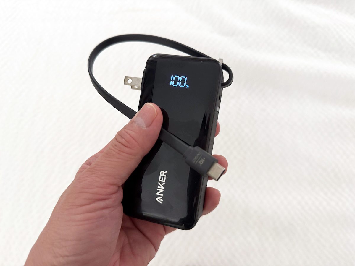 この手の「充電器+バッテリー」な製品は、機内で使用できないケースが出てくるので注意です(製品は「Anker Power Bank (10000mAh, Fusion, Built-In USB-C ケーブル)」)