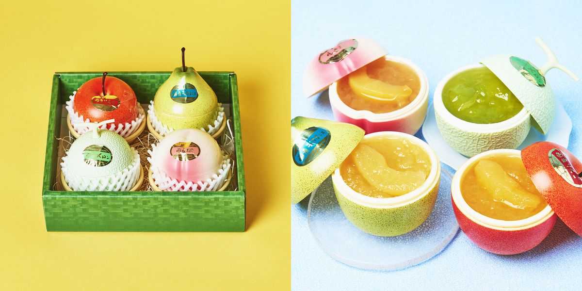 フルーツ型の器に入った、ゼリーのギフトボックス。国産フルーツをすりおろしたり、ピューレにしたりすることで、ゼリーもフルーツも本来の味わいが楽しめます。
