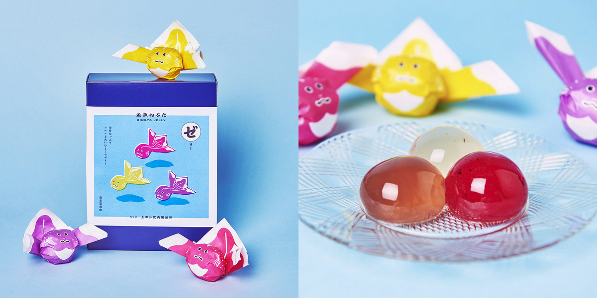 金魚ねぶたをモチーフにしたカラフルな金魚の包み紙でくるんだ、一口サイズのゼリー。青森県産の果物を中心に、アップル、カシス、巨峰の果汁をふんだんに使用しています。昔ながらの風船型ゼリーで、楊枝で刺せば、まんまるゼリーがぷるんとお目見え。