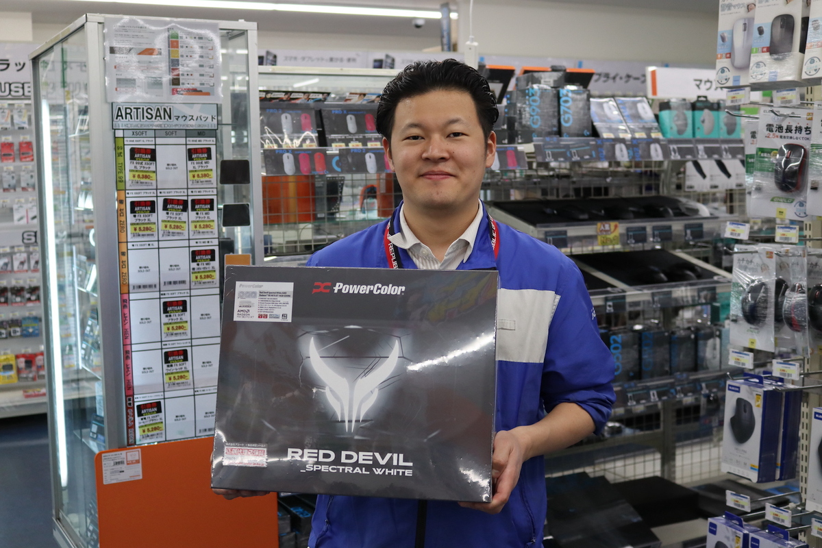 大阪・日本橋のPCパーツショップ「パソコン工房 大阪日本橋店」を取材。店舗スタッフ・小山翔さんのオススメは、PowerColorのビデオカード「Red Devil Spectral White AMD Radeon RX 9070 XT 16GB GDDR6」(以下、RX9070XT 16G-E/OC/WHITE)です。