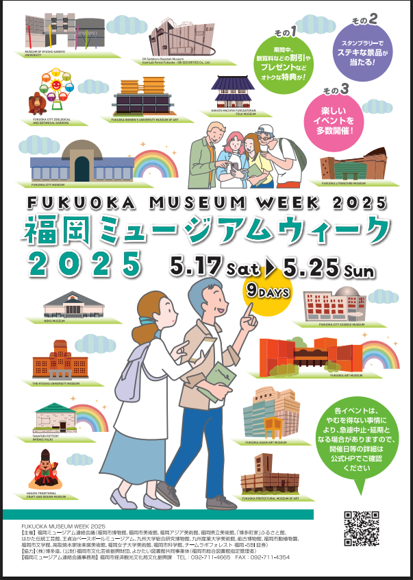 経済観光文化局文化まつり振興部文化振興課は、5月17日から5月25日までの9日間にわたり、『福岡ミュージアムウィーク 2025』を開催する。市内16の参加施設において、観覧料割引や特典、スタンプラリーによる抽選会など、さまざまなイベントが展開される。