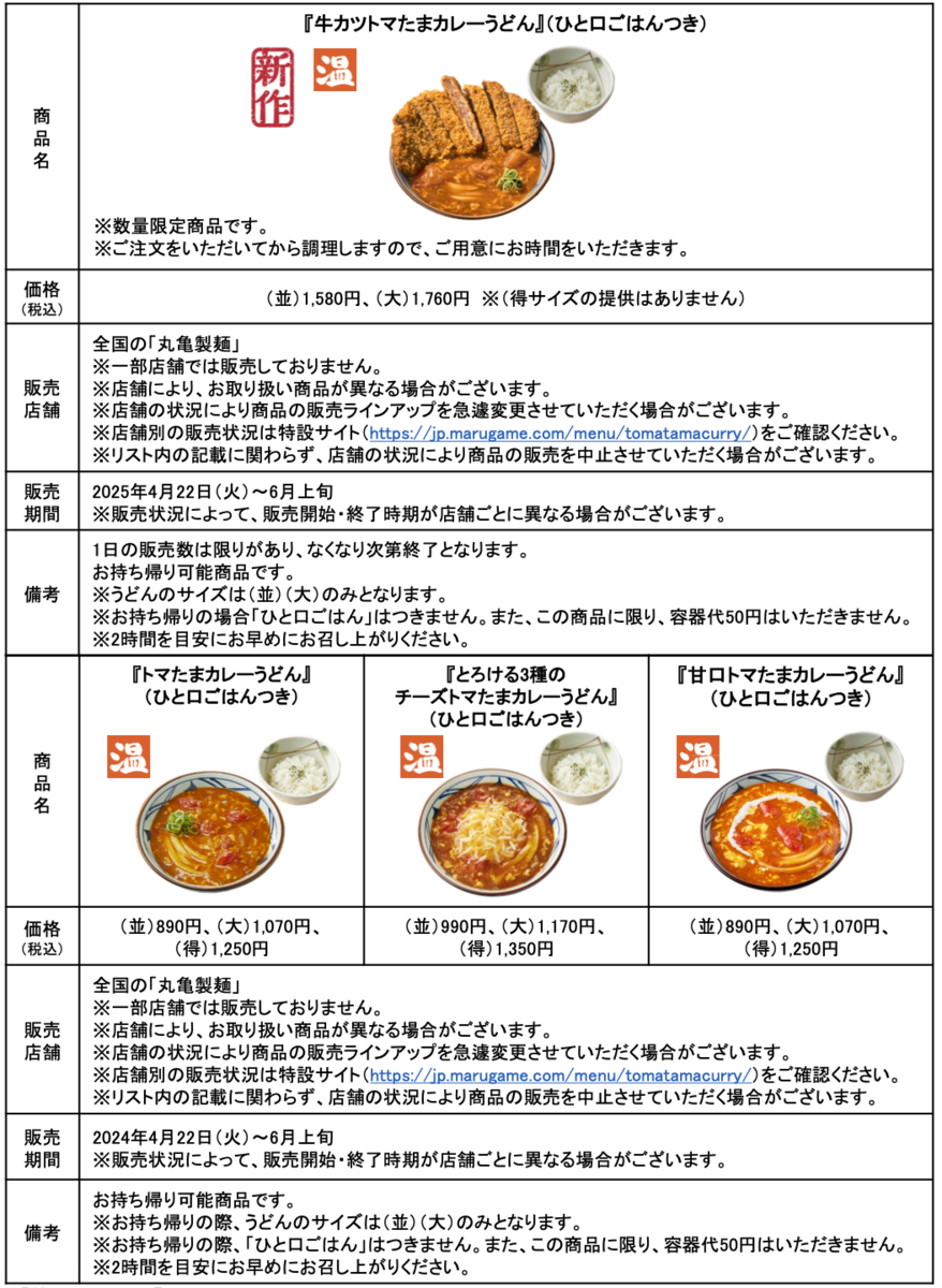 丸亀製麺は、4月22日から「トマたまカレーうどんシリーズ」全4種の期間限定販売を開始。新作の「牛カツトマたまカレーうどん」が数量限定で登場します。