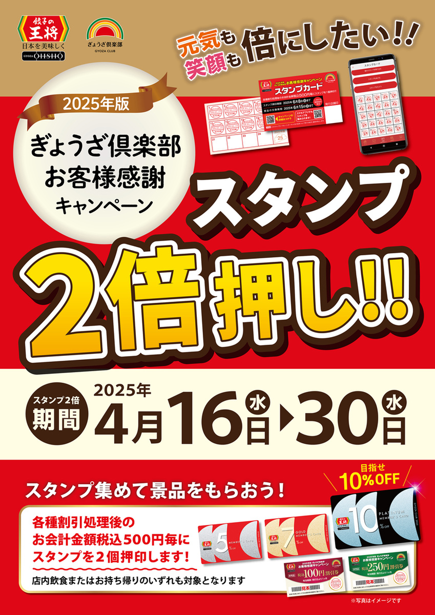 餃子の王将とGYOZA OHSHOでは、現在実施中の「2025年版 ぎょうざ倶楽部 お客様感謝キャンペーン」の一環として、4月16日~30日の期間限定で、スタンプが通常の2倍になる「スタンプ2倍押し!!」を実施します。