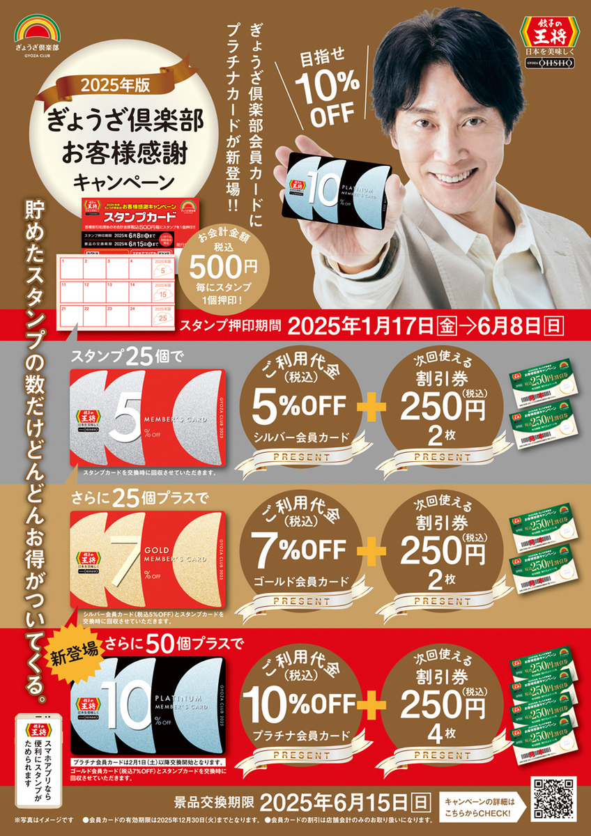 スタンプ25個:ぎょうざ倶楽部シルバー会員カード(会計5%割引)+250円割引券2枚