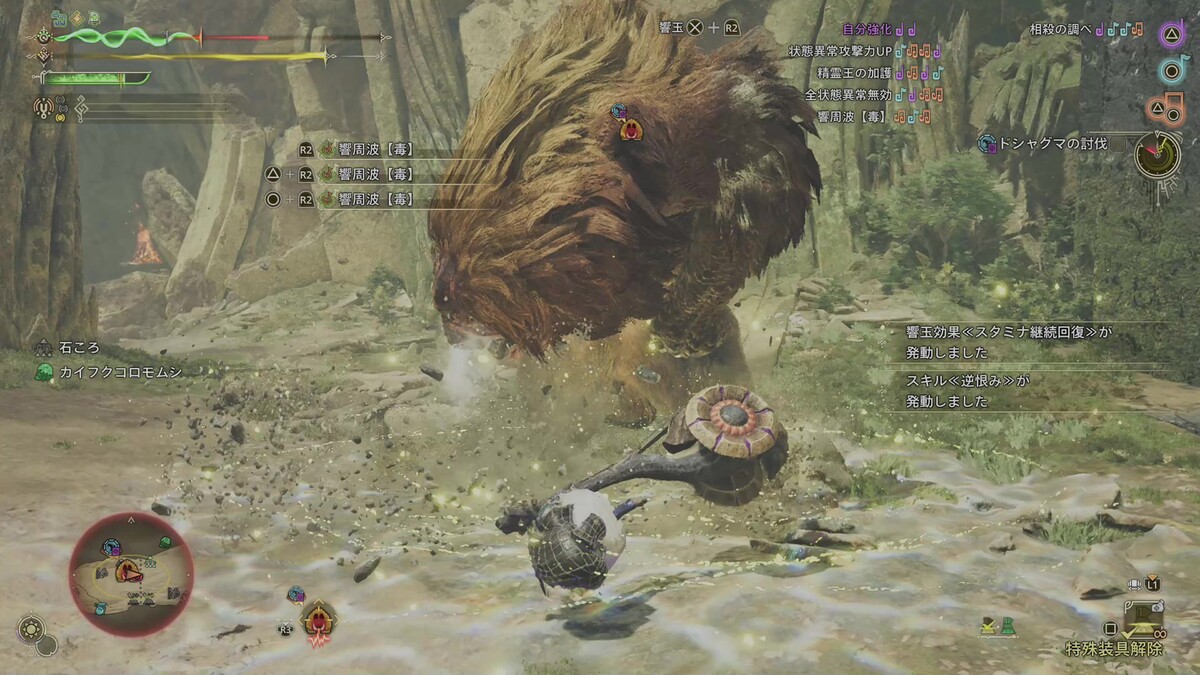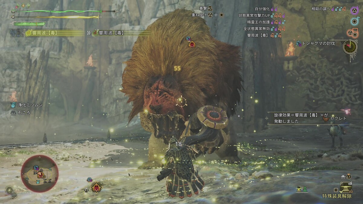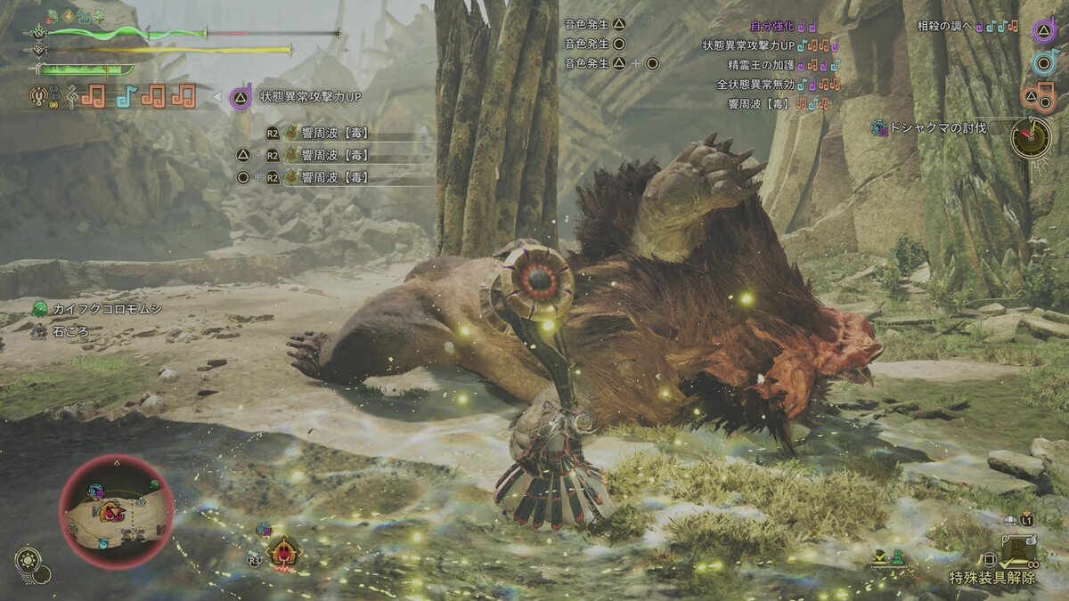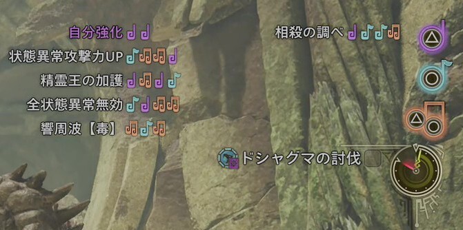 「モンハンワイルズ」の狩猟笛は「響玉」というエリアを設置し、そのなかで演奏すると敵に多段ダメージを与えられる。これが非常に強力で、「いかに早く旋律を溜め、いかにエリア内にドシャグマを留め、いかに演奏をたたき込むか」というポイントに重点をおく戦法でなんとかランクSを達成した。