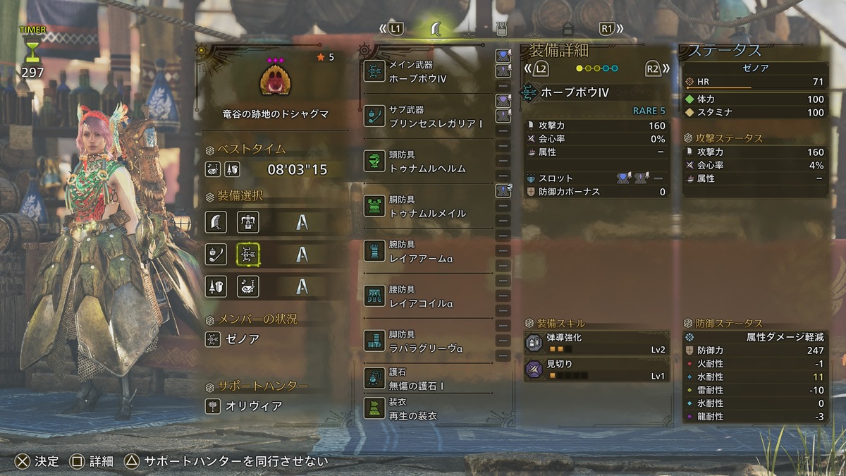 これはいわゆる「闘技大会」のクエストとなり、装備を指定されたもののなかから選ぶため、シンプルにハンターの腕が試される種類のクエストだ。今回の相手は「ドシャグマ」で、武器種は「大剣/ヘビィボウガン」「操虫棍/弓」「ランス/狩猟笛」の3セット6種類から選択可能。