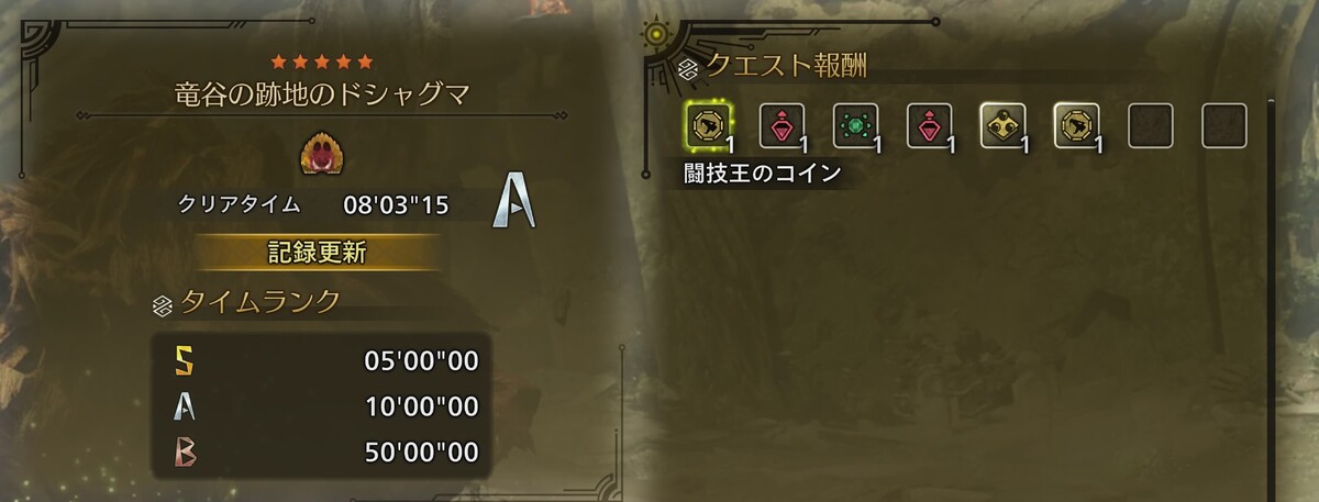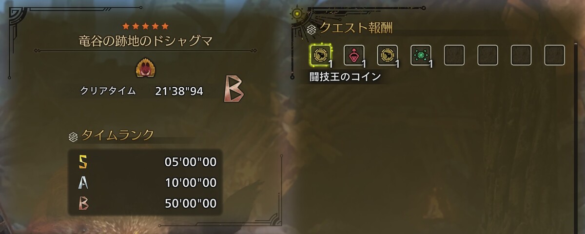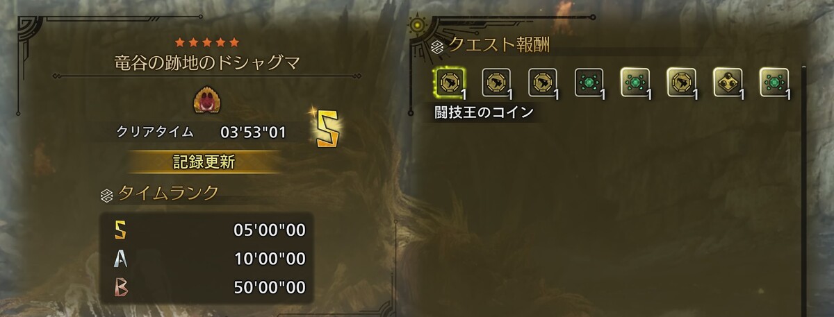 武器種の選定と練習に2時間、実戦で2時間の計4時間かけてランクSを獲得できた。響玉エリアの外でドシャグマがダウンした時などはコントローラーをぶん投げそうになったものだ。