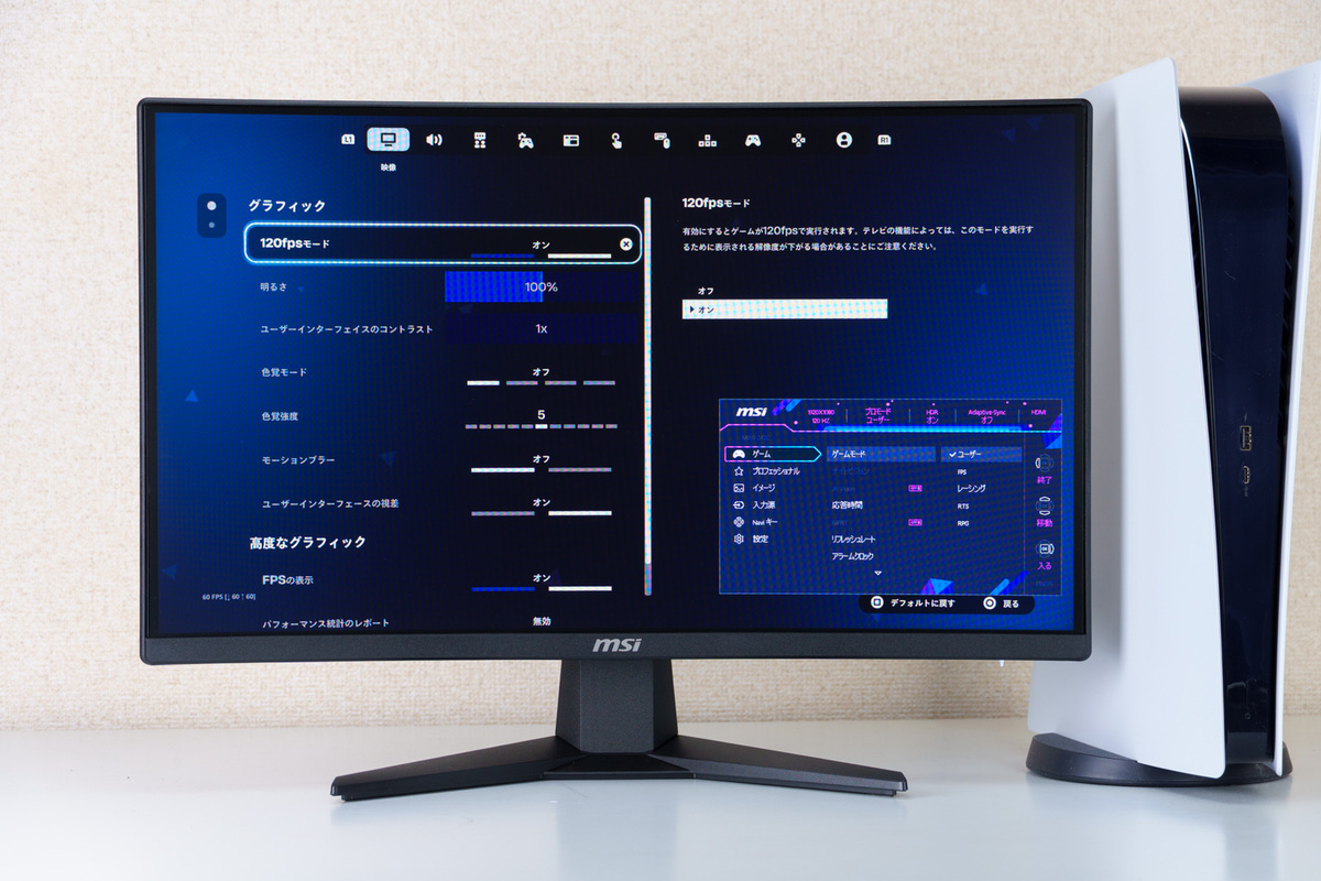 PS5を接続して同様にプレイしてみたが、、「フォートナイト」のような120Hz駆動に対応しているのでゲームだと、より滑らかな映像で楽しめる。HDRにも対応しているので、光の表現力は美しく、リアリティが増した。