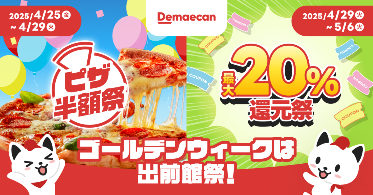 ゴールデンウィークの楽しみをさらに盛り上げるべく、出前館ではゴールデンウィーク期間中を「出前館祭」として、ピザを手軽に楽しめる「ピザ半額祭」と、期間中の注文合計金額に応じてクーポンがもらえる「最大20%還元祭」の2つのキャンペーンを実施する。