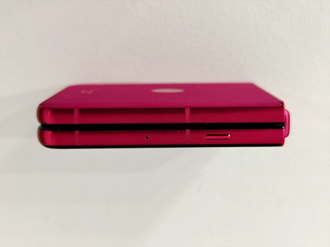 本体左側には前モデルまではSIMカードスロットがあったが、razr 60 Ultraにはなくなった。その代わりにボタンが1つ搭載されている。これはモトローラのAI機能「moto ai」を呼び出す専用ボタンだ。