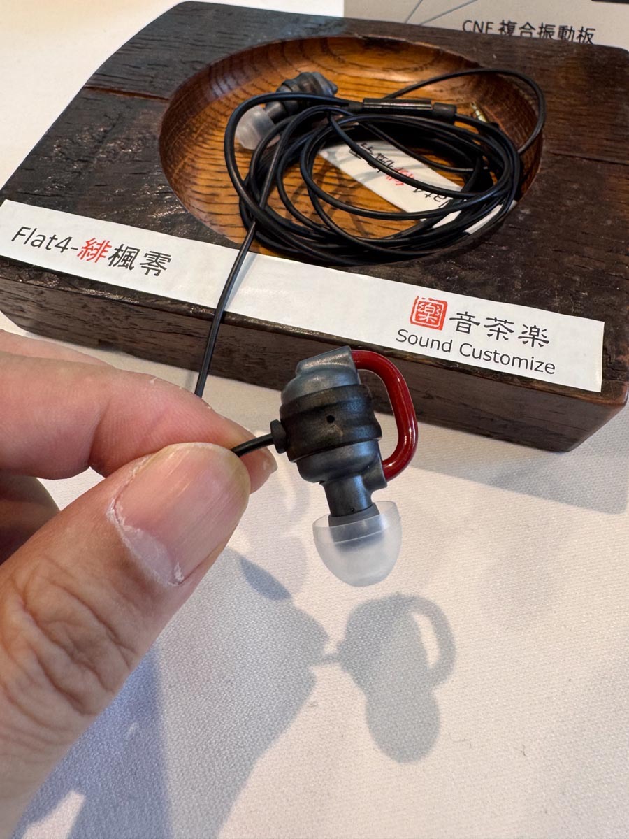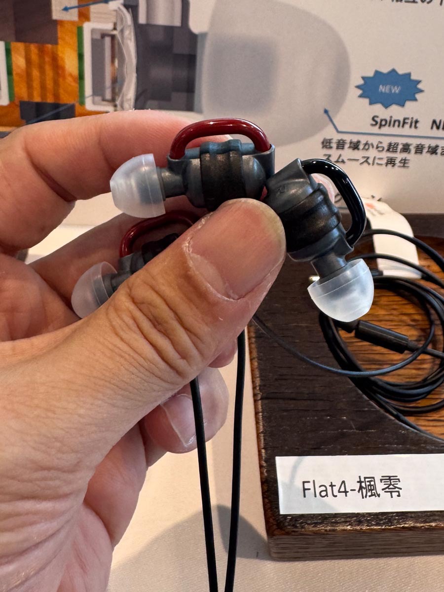 高域の不要な成分を物理的に減衰させる独特の機構を持つ「Flat 4 楓零」。新機種が参考出品されていた。「Flat 4 緋楓零」はチューブの長さが28mmに対して30mmと少し長くしている。チューブは6kHz付近で発生する共振の成分を減衰させる効果があるという。ドライバーの後ろから出る逆位相の波を当て、物理的に対策する仕組み。