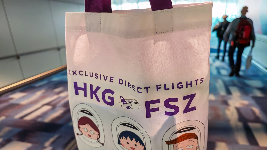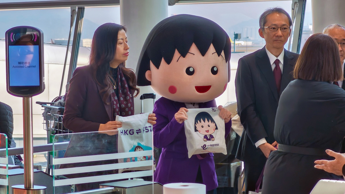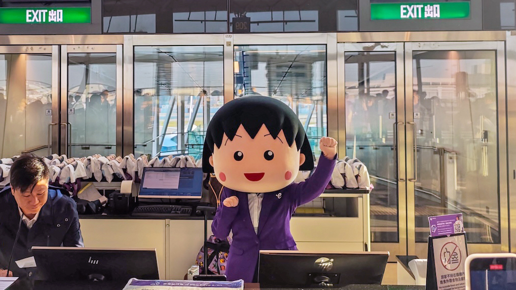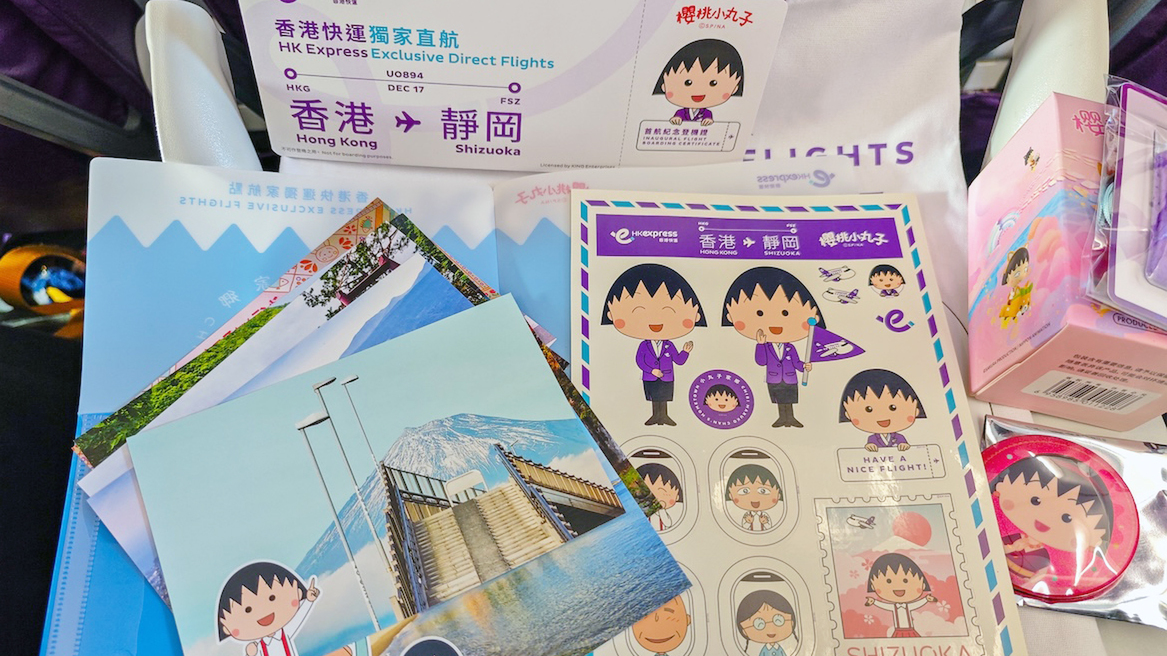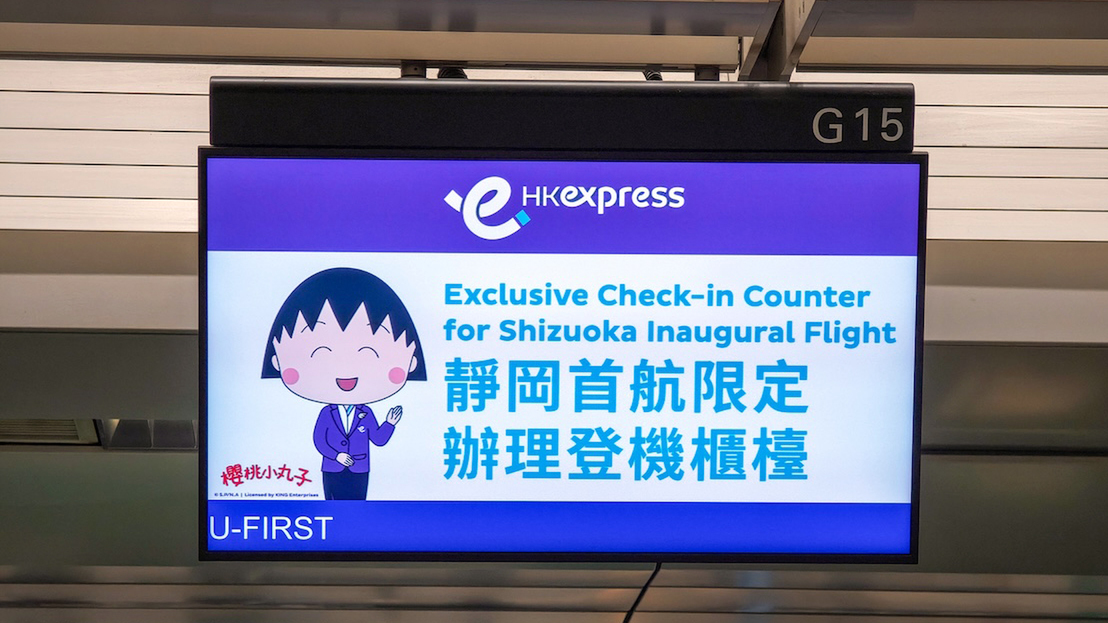 この時点、すでに初便らしさを発見! チェックインカウンターのディスプレーには「ちびまる子ちゃん」のイラストが表示されていました。そう、静岡県といえば、ちびまる子ちゃんの舞台となる清水区(旧清水市)があり、作者のさくらももこさんの出身地でもあります。しかも「ちびまる子ちゃん」は、香港でも「櫻桃小丸子」というタイトルで親しまれているコンテンツ。今回の初便はちびまる子ちゃんとのコラボとなっているようです。
