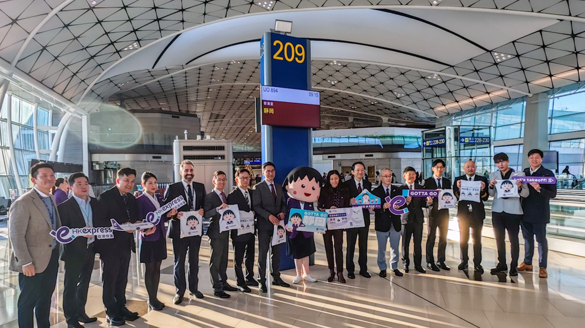 チェックインを済ませて搭乗ゲートでまっていると、なんと香港エクスプレスの制服を着た、まる子が登場。まるで大人になったまる子が香港エクスプレスで働いているかのように、ボードを持って取材や搭乗者との写真撮影に対応していました。