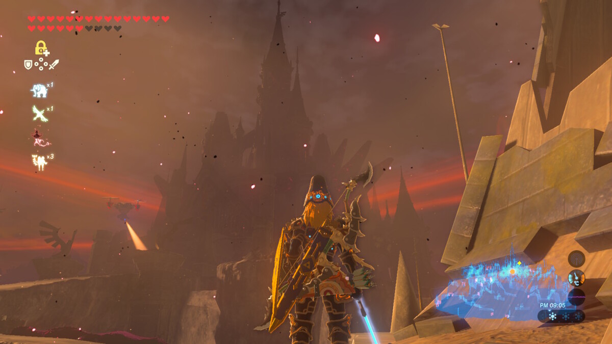 完全に最初から遊ぶニューゲームではなく、試遊会向けに用意された途中データを使用、ラスボスの待つハイラル城の正門前からのスタートとなった。武器や防具もある程度揃っており、「英傑の加護」も使用可能という条件だ。