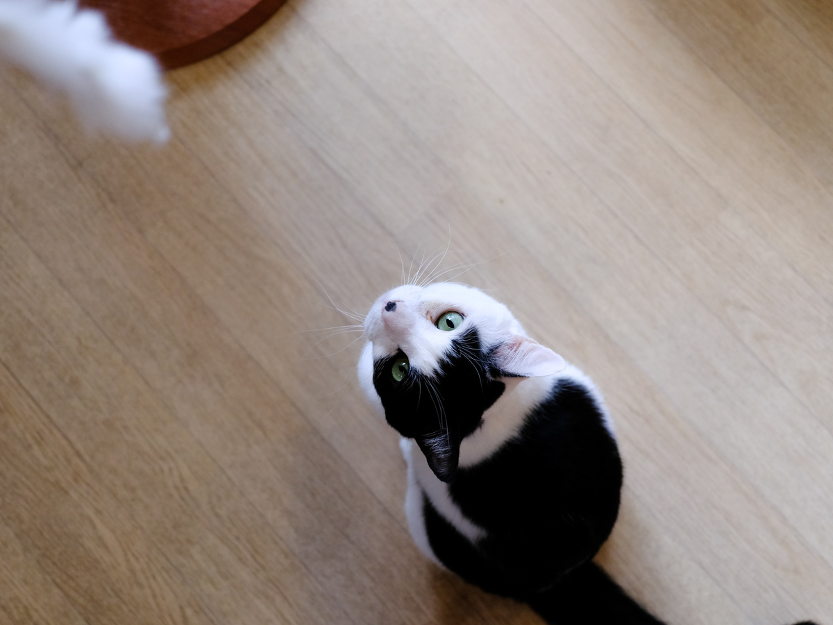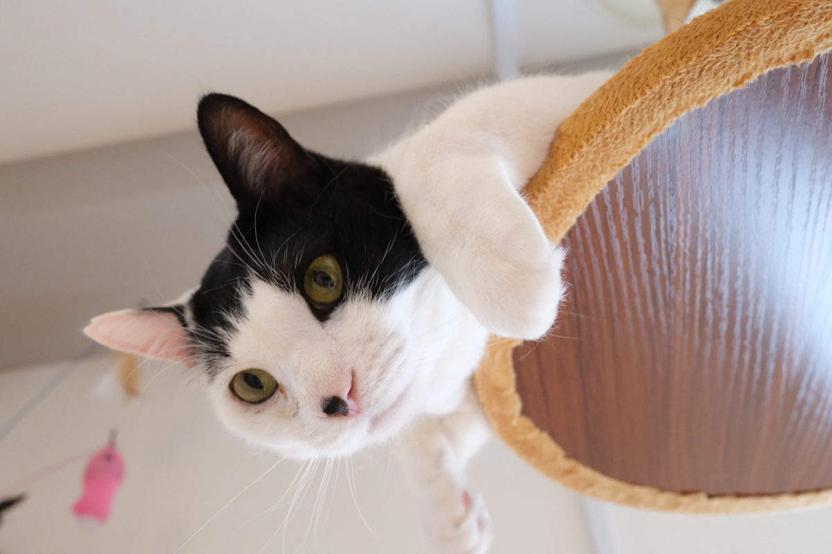猫に挨拶してたら、遊んでほしそうな顔で白黒の猫が見下ろしていた。名前はしんのすけ。キャットタワーから身を乗り出している姿が可愛かったので、モニターを開いてローアングルで狙ってみた。