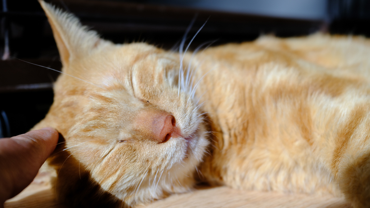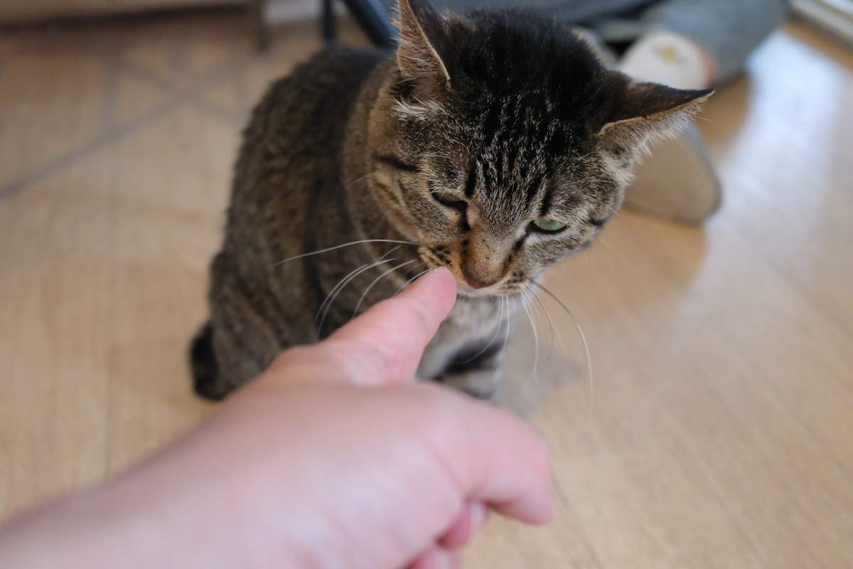 左手で猫に挨拶しつつ、右手でファインダーを覗いて撮影。こういうとき猫瞳AFが仕事をしてくれると助かる(そうじゃないと人の指にピントがあったりしちゃうから)。2025年4月 富士フイルム GFX100RF
