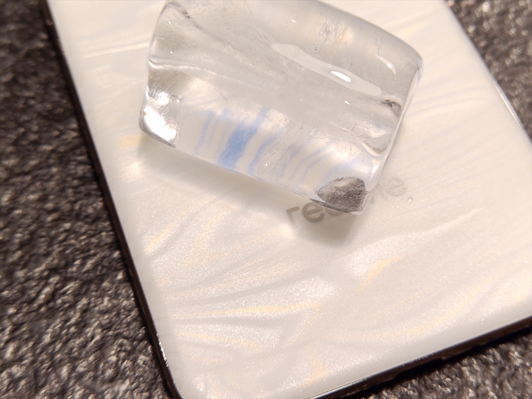 実際に背面に氷を置いたところ、氷の当たっている部分が青く変色しているのがわかる。氷の表面が触れていない部分は16度以下になっていないため色が変わらない。