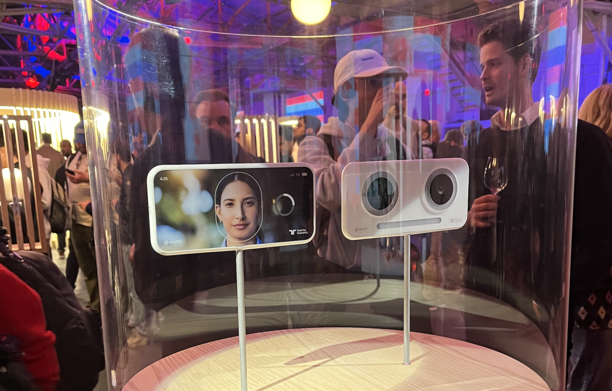 イベント終盤には「Orb Mini」と呼ばれるスマートフォン状のデバイスも披露した。詳細なスペックや販売形態などは明かされていないものの、レンズを2つ背面に備え、設置型のOrbと同様に、ユーザーの虹彩をスキャンする機能を実装するもののようだ。