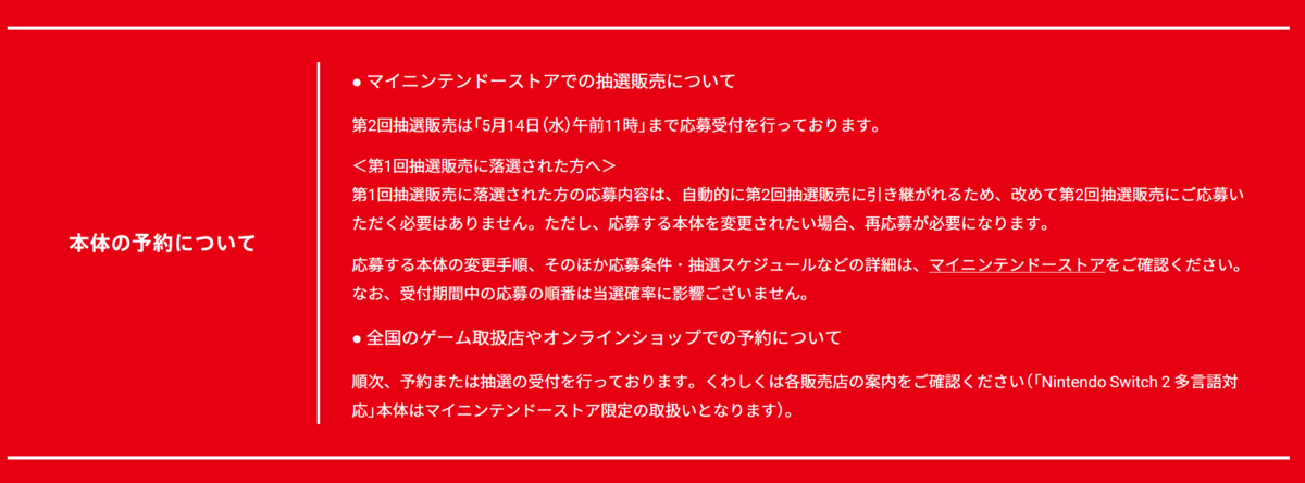 任天堂は5月1日、マイニンテンドーストアで受け付けていた「Nintendo Switch 2」(ニンテンドースイッチ2)の第1回抽選販売の当選者向けの購入手続きを開始した。期間は5月1日12時~5月12日11時までとなる。