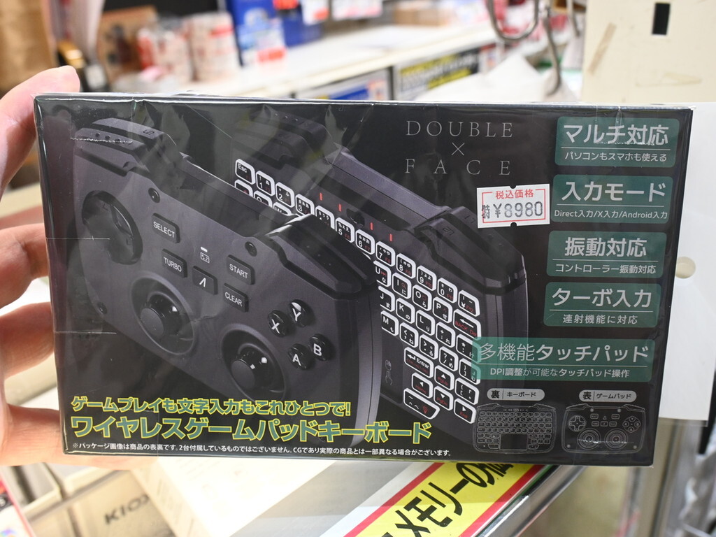 ゲームコントローラーとキーボードを合体させた2-in-1デバイス「ダブルフェース」がエアリアから発売。千石電商 秋葉原本店とテクノハウス東映にて8980円で販売されている。