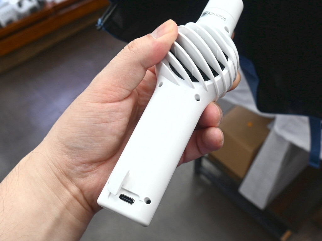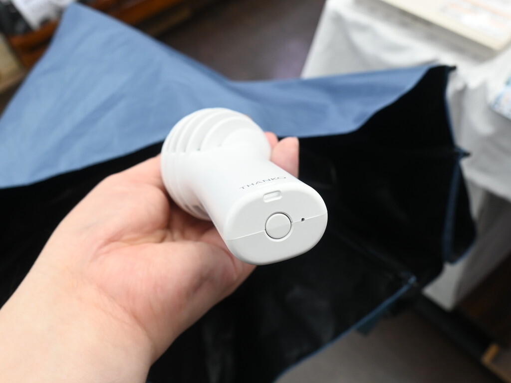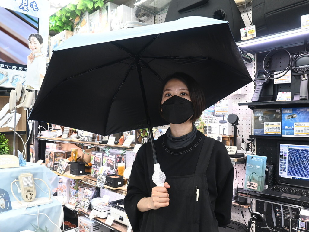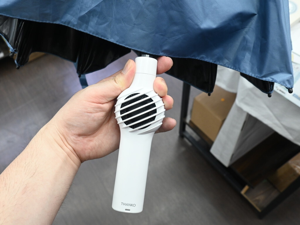 日傘と一緒にハンディファンを運用していたという人にとっては、片手が空く点がメリット。扇風機機能はUSB充電式で、約4.5時間の充電で約3.5時間使用できる。充電ポートには防水カバーも付いており、雨の日でも安心して使用可能だ。