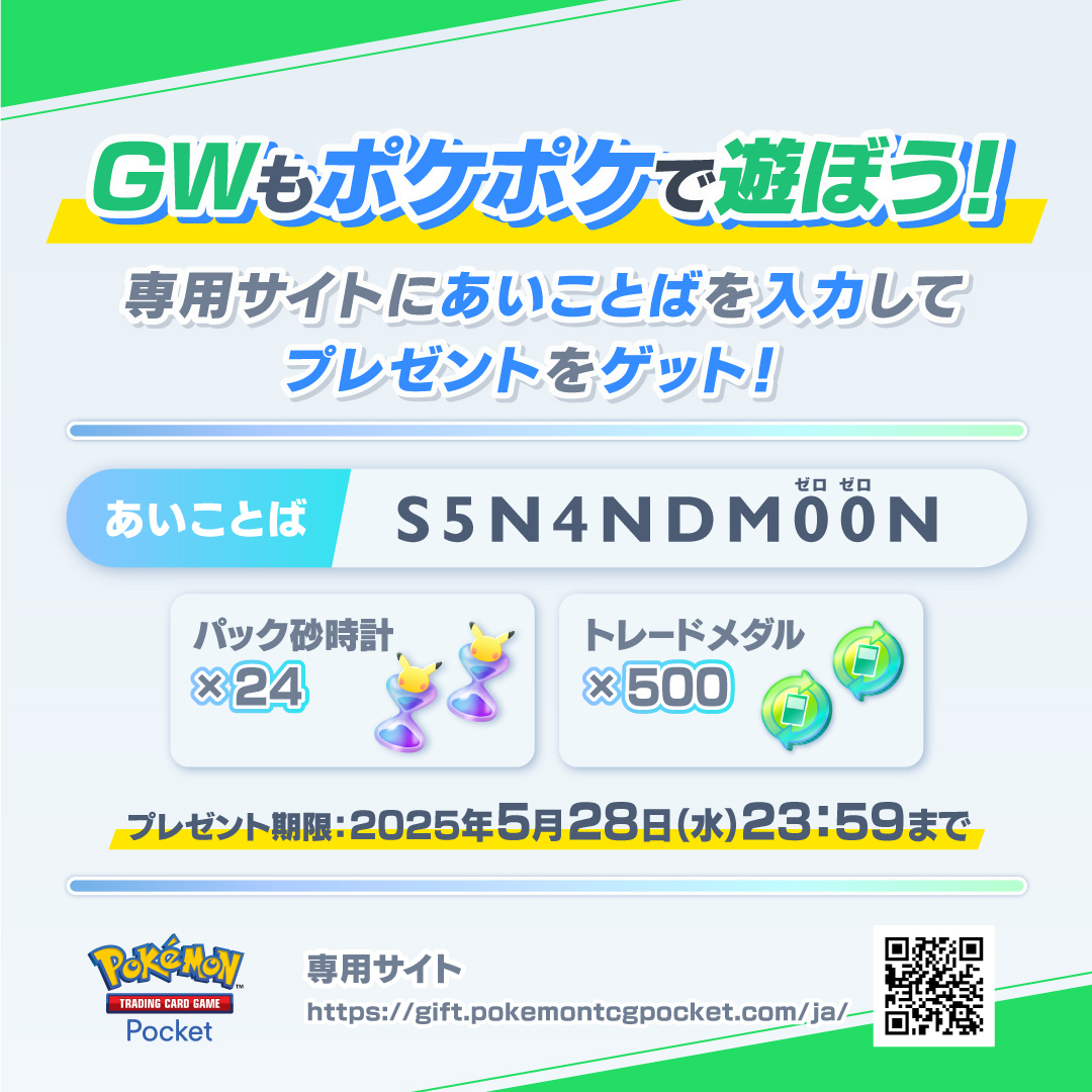 ポケモンは5月2日、「Pokémon Trading Card Game Pocket」(ポケポケ)公式X(Twitter)にて【GWもポケポケで遊ぼう!】キャンペーンの告知を行った。