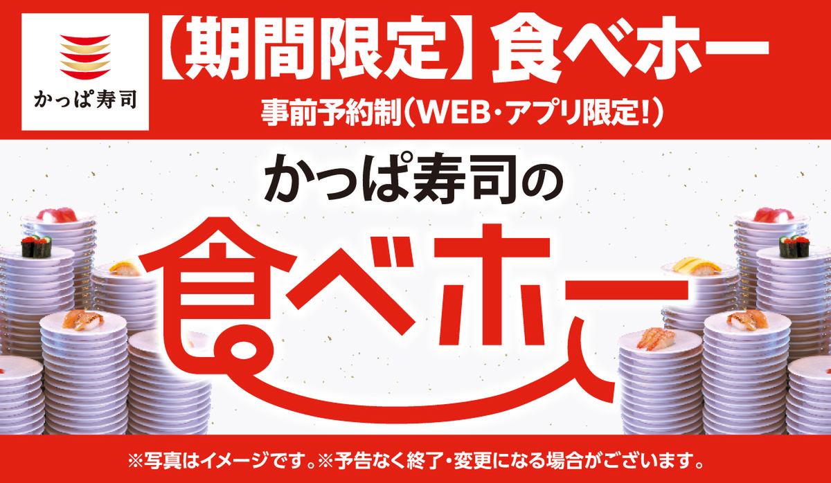 寿司チェーン「かっぱ寿司」は、食べ放題企画「かっぱ寿司の食べホー」を5月8日~5月28日の期間(予定)、店舗・期間限定にて191店舗で開催します。期間中。常時開催の店舗とあわせて計200店舗で開催。