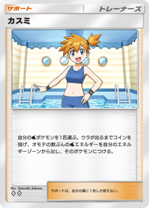 なんのかんの言ってカスミは結構重要です。実際に使ってみたところ、このデッキでは、ベンチにヨワシの魚群を揃えるよりも、ヨワシexにエネルギーを3つ付けるほうが大変という印象すらありますので、カスミさまが1個でも水エネを付けてくれたら拝んでもいいレベル。
