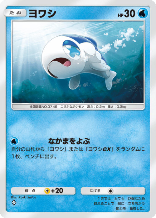 そして、ヨワシはヨワシexの進化前ではなく、ただのHP30の水タイプというだけのポケモンです。ワザも「なかまをよぶ」で、ヨワシ、またはヨワシexを山札からベンチに呼び出すだけしかできません。