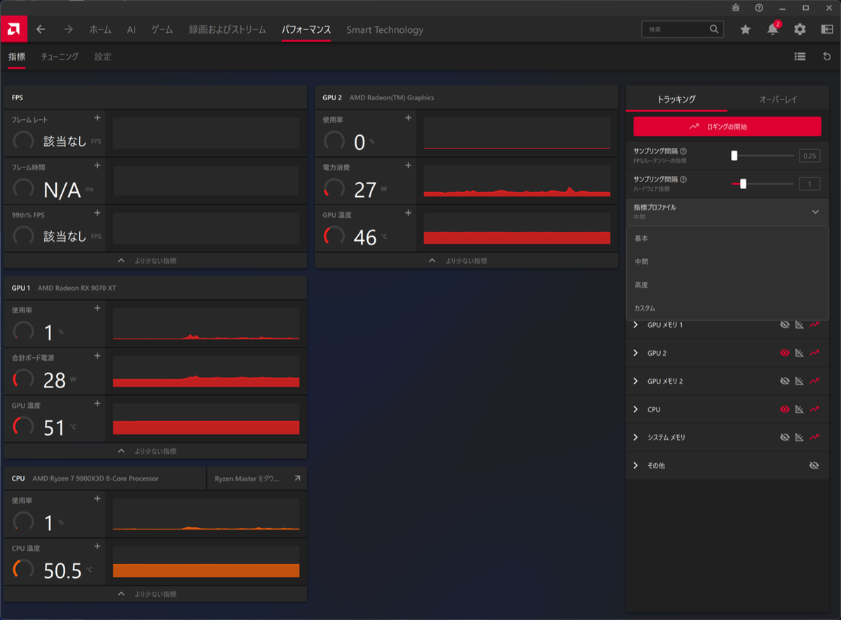 Radeonの温度や消費している電力(ボード電源と表記)は「指標」タブで閲覧できる。CPUもAMD製の場合はCPUの使用率や温度もチェックできるのはうれしい。右側の「指標プロファイル」を変更することで、表示する情報の詳細度を変更できる。また「サンプリング間隔」は情報が更新される間隔だが、細かく推移を見たいなら最少の0.25にしておこう
