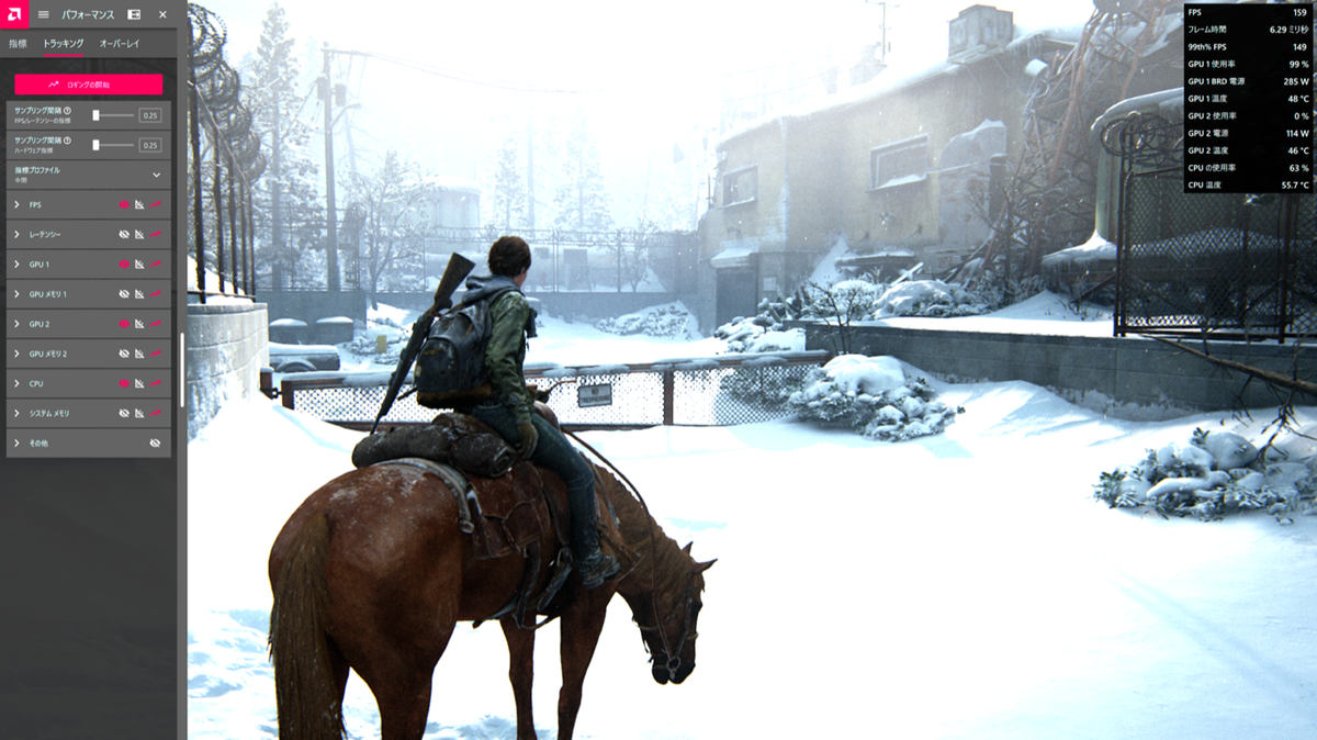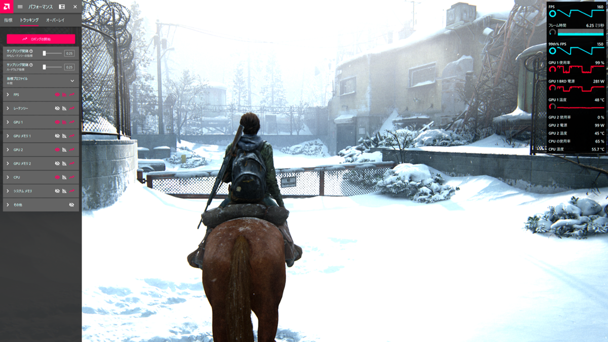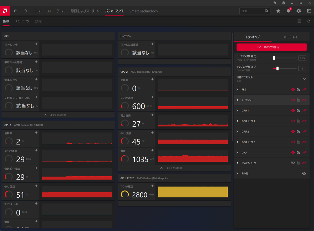 最後の大物は「パフォーマンス」タブだ。これは文字通りGPUのクロックや温度からフレームレートに至るまで、ハードウェアの状態確認やそれをログに取る(≒ベンチマークする)ことができる。筆者のようにハードのレビュー記事を書くわけでもない場合でも、今GPUがどんな状態でどの程度のフレームレートを出せているのか、知ることができるのは非常に大きい。
