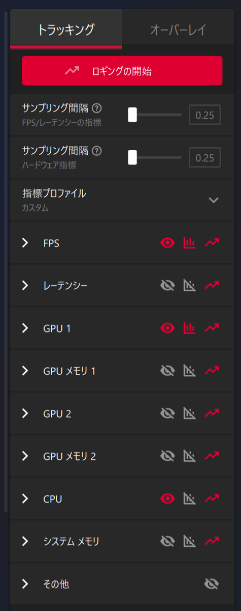 オーバーレイにあれもこれもと出すのは邪魔なので、「トラッキング」タブで項目を絞ってくといい。眼のアイコンは表示のオン・オフ、稲妻矢印はログのオン・オフ、中央の三角はグラフ化のオン・オフだ。赤くなればオンの意味である