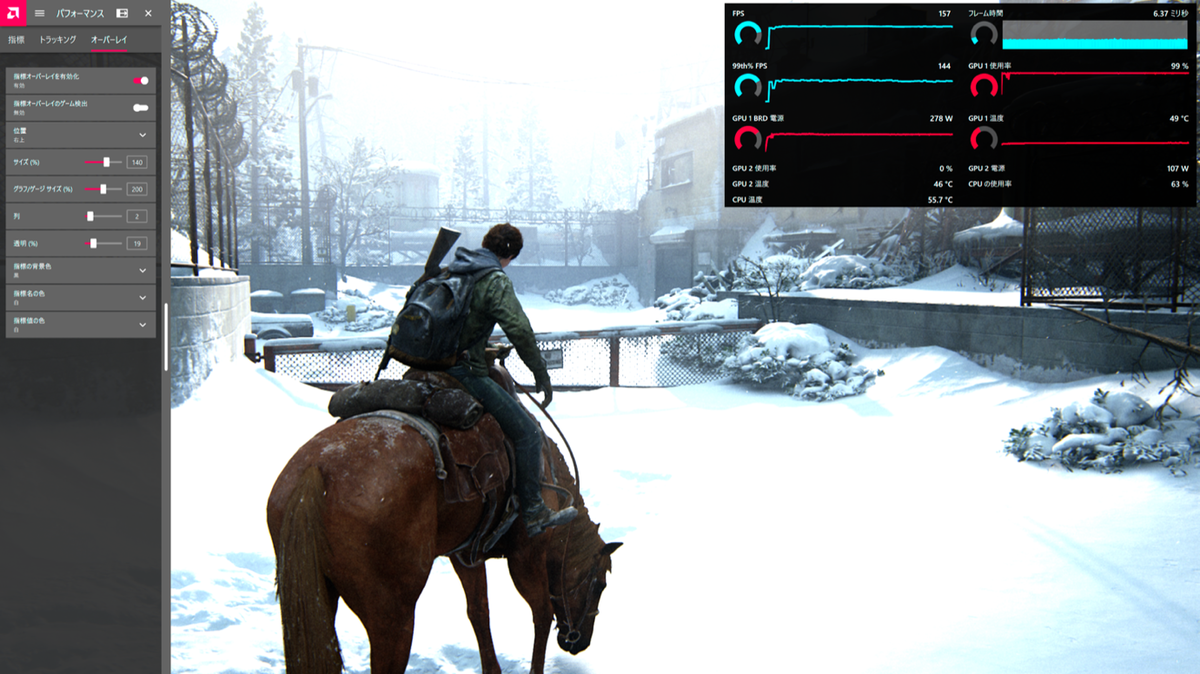 「オーバーレイ」タブの中にある「指標オーバーレイを有効化」をオンにすることで、フレームレートやGPUの各種情報がオーバーレイ表示されるようになる。ゲーム中だけオーバーレイを出したければ「指標オーバーレイのゲーム検出」もオンにしておこう