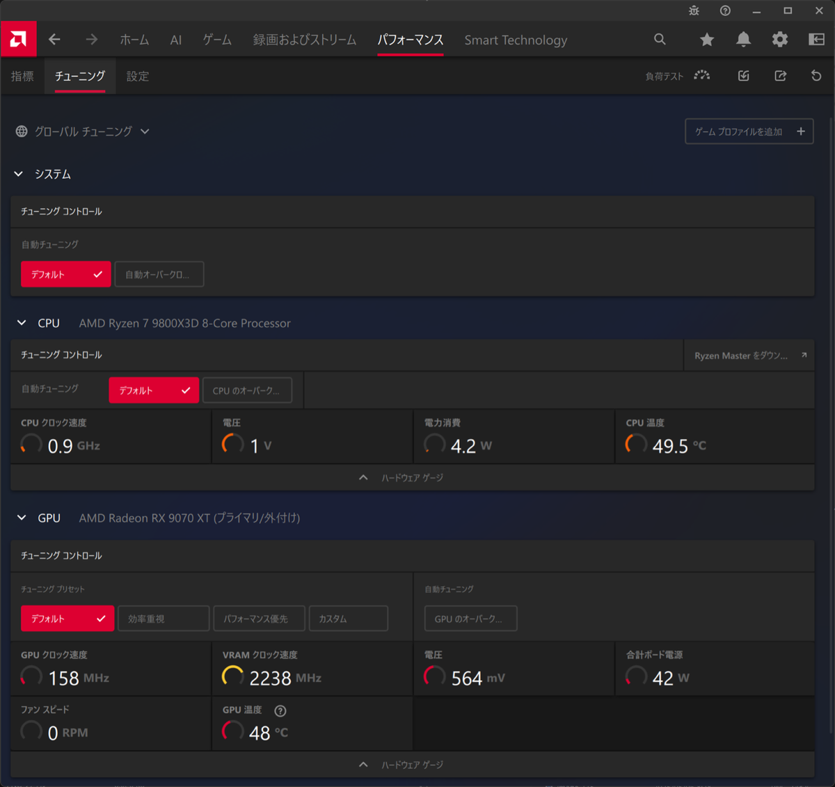 また、パフォーマンスタブではGPUやCPU(Ryzenのみ)のオーバークロック(OC)も可能だ。ただ本稿ではOCの詳しい手順については割愛する。