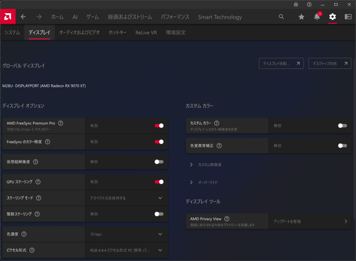 まずは「ディスプレイ」タブ。FreeSync対応ディスプレーを持っているなら、ここで「AMD FreeSync Premium Pro」をオンにしておけば、グローバルで設定が有効になる。「仮想超解像度」はディスプレーの実解像度以上の解像度でレンダリングできるようにするもの。フルHD液晶しかなくても仮想超解像度で4Kレンダリングさせてから出力すれば、ディテールが向上する場合がある