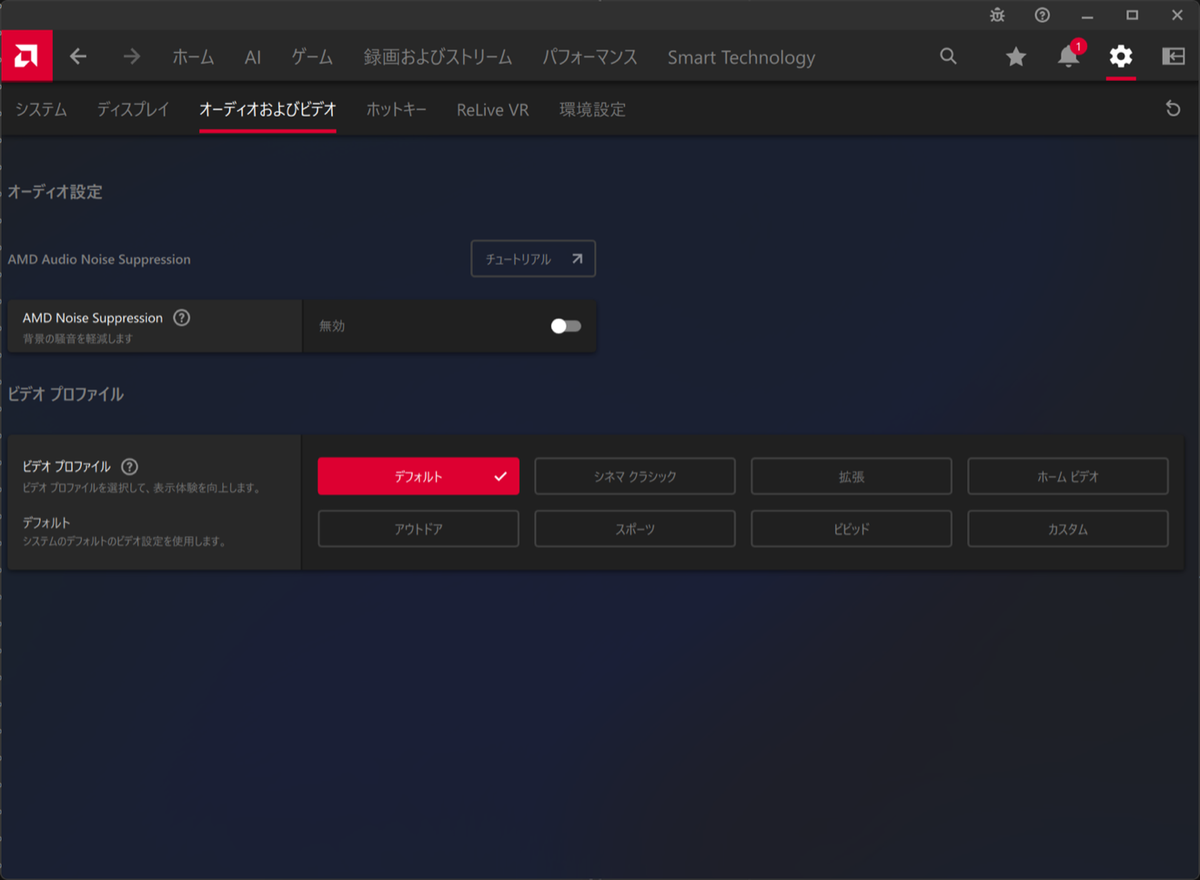 「オーディオおよびビデオ」ではAIを利用して背景雑音を除去する「AMD Noise Suppression」を有効化できる。ZoomやTeamsといったツールのノイズリダクション機能に不満があるなら使ってみたい