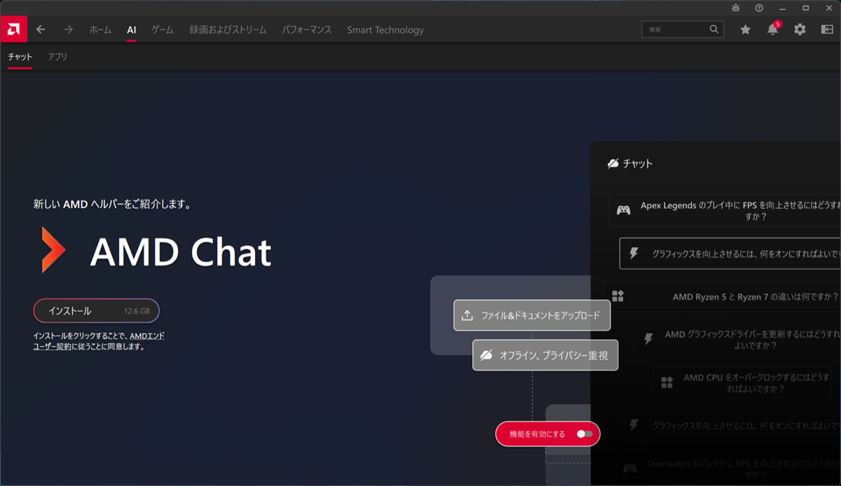 解説していない「AI」タブについては、RX 9070シリーズのレビューを参照のこと。ローカルLLM環境を構築してチューニングの手助けをしてくれるというものだが、まだまだブラッシュアップが必要だろう