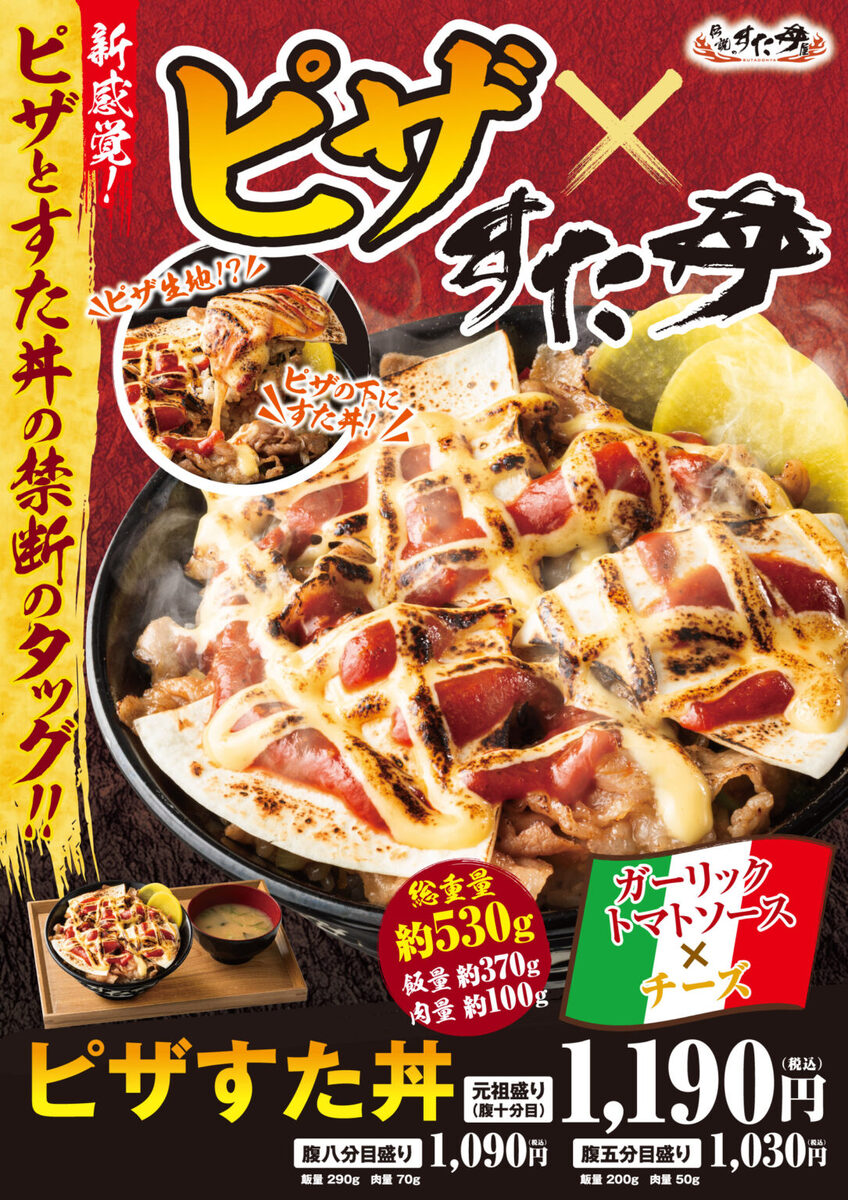 同チェーンの看板メニューであるジューシーで柔らかな豚バラ肉に“秘伝のニンニク醤油ダレ”を絡めた大盛りの「すた丼」に「ピザ」を組み合わせたという一杯。丼の上にはピザ生地がのっており、その下のすた丼と共に楽しめるようになっている模様です。ピザはガーリックトマトソースとチーズ。
