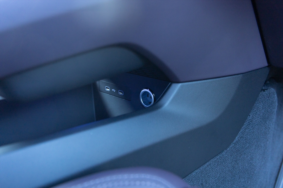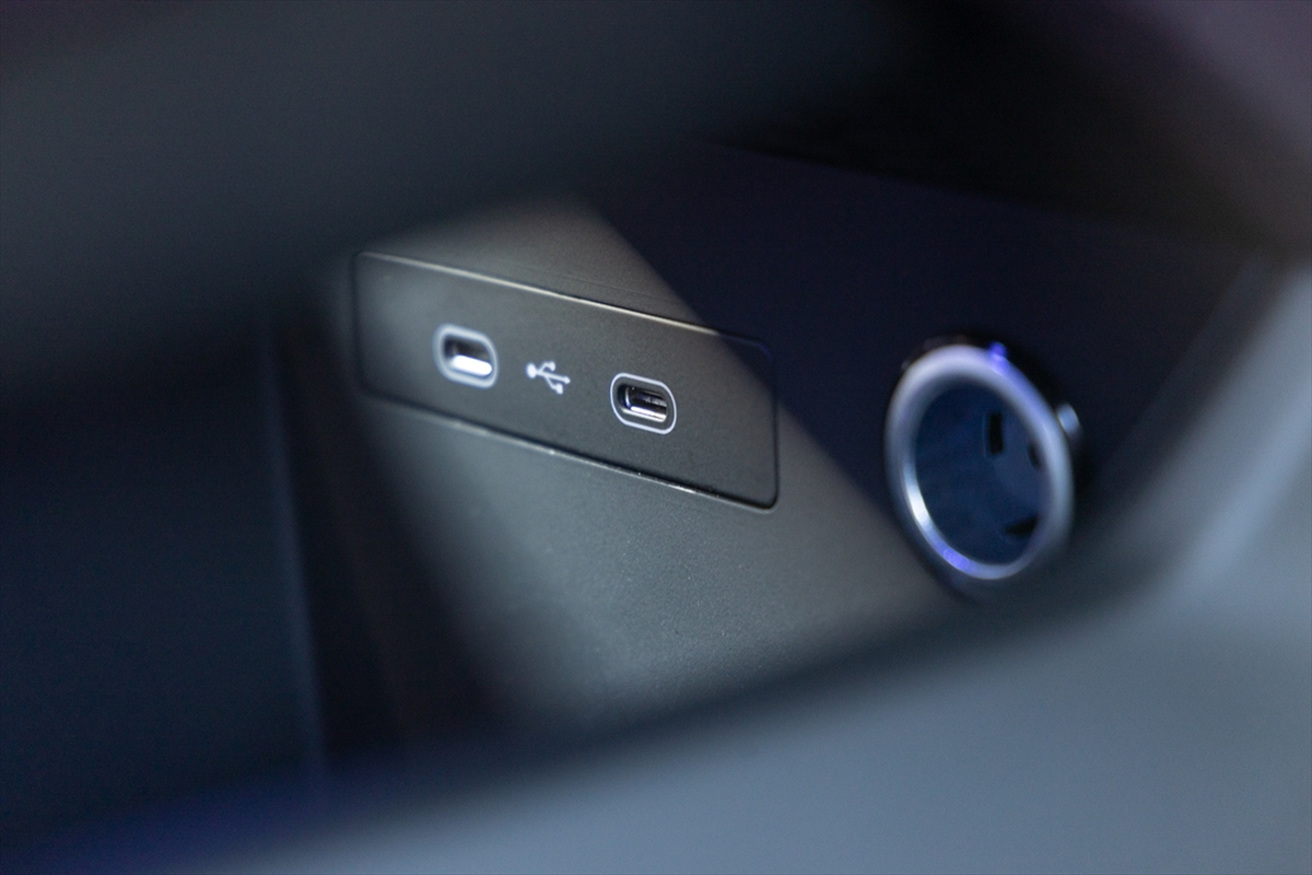 運転席周りのUSB Type-C充電端子は、二階建てセンターコンソールの下側に配置。近くに12Vアクセサリーソケットも用意されている。