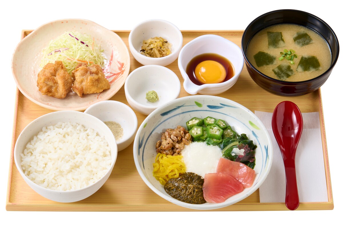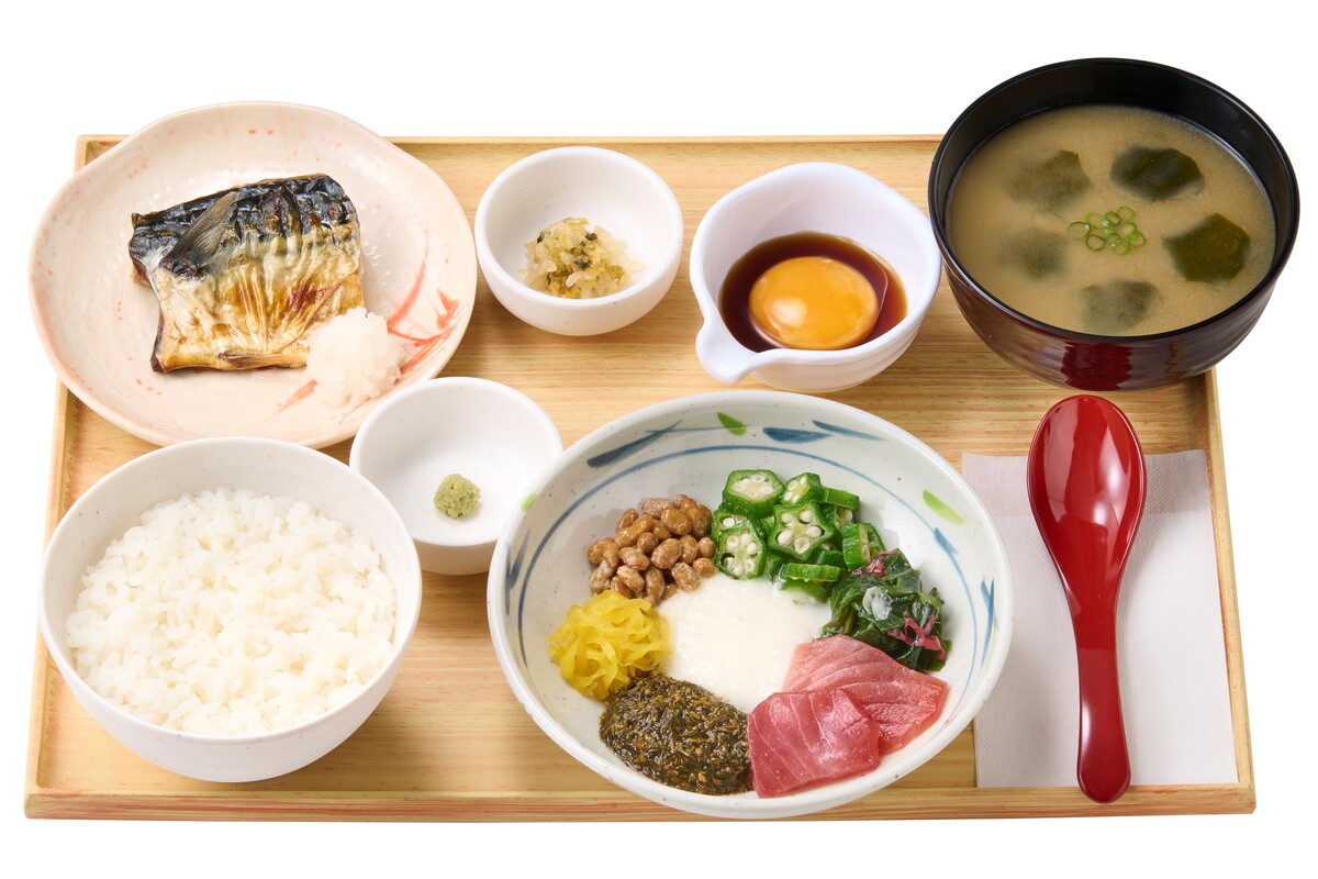 「アカモクねばとろ定食」は、ねばねば食材の納豆・とろろ・オクラとまぐろや海藻サラダ、刻みたくあんなどさまざまな食感と味わいを一皿に盛り込み、見た目にも鮮やかで食欲をそそるという一品。